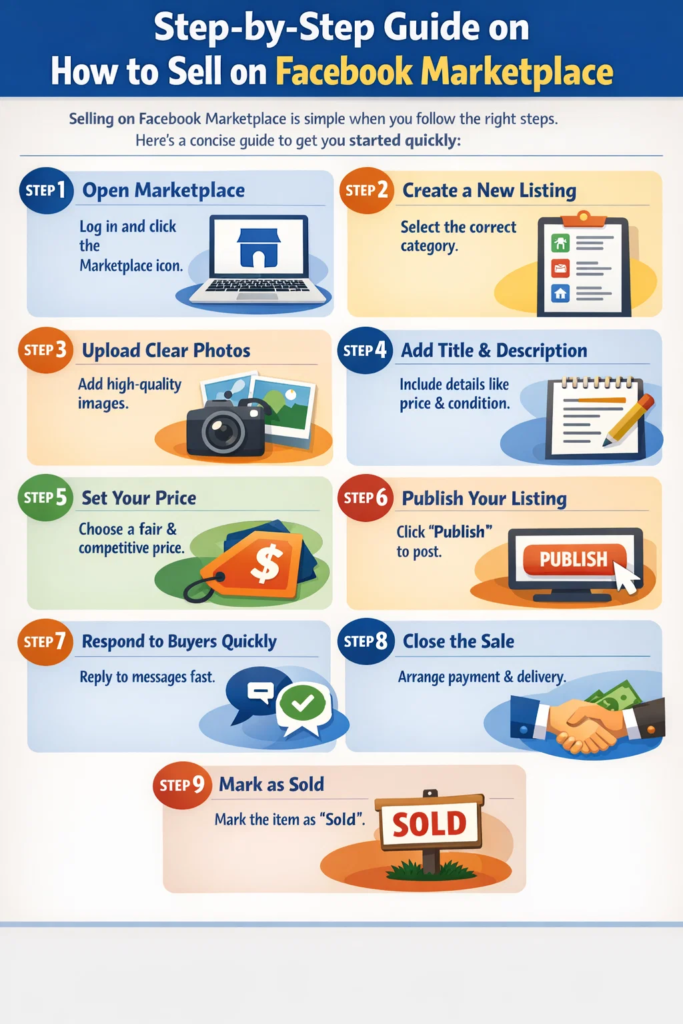 Selling on Facebook Marketplace is simple when you follow the right steps. Here’s a concise guide to get you started quickly: