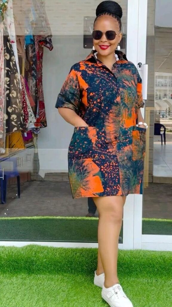 If “effortlessly stylish” was a dress, it would be the button-down Ankara gown. Inspired by classic shirt dresses, this style combines structure with comfort, making it one of the most versatile simple ankara gown styles for women.